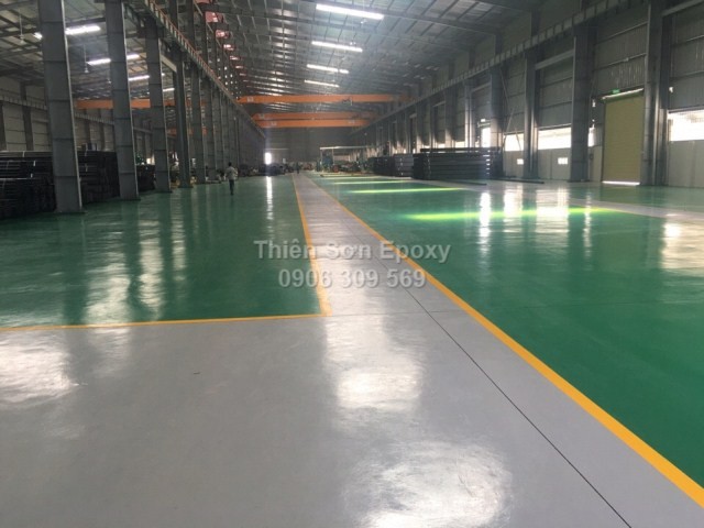 Hạng mục: Thi công sơn sàn epoxy lăn rulo 03 lớp bao gồm 3 hạng mục chính: Thi công sơn epoxy màu xanh (Green) cho khu vực sản xuất, màu ghi (xám) cho khu vực đường đi và thi công sơn epoxy kẻ line màu vàng phân chia khu vực đường đi và khu vực sản xuất.