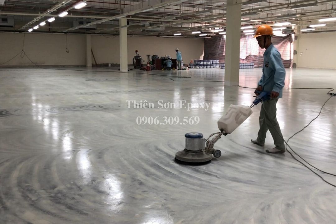 Mài xử lý bề mặt sàn bằng máy mài sàn công nghiệp kèm máy hút bụi, giúp xử lý tạo nhám và chân bám cho lớp sơn epxoy tự san phẳng liên kết chặt chẽ với sàn bê tông. Cần làm tốt công đoạn này, nếu không sản phẩm sẽ không đạt được chất lượng tốt nhất cho công trình hoàn thiện sau này.