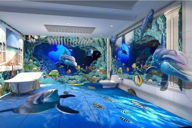 12. Mẫu 12: Phòng khách độc đáo với đáy biển cùng những chú cá heo đang tung tăng bơi lội.