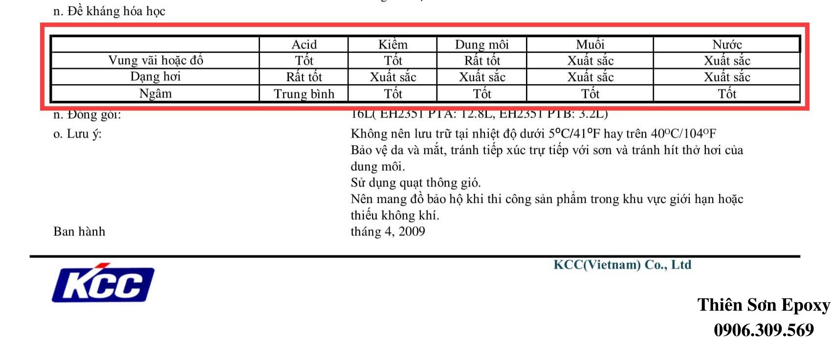 Sơn kháng hóa chất EH2351 là sơn hai thành phần (A và B), gốc nhựa Epoxy, chống bài mòn với khả năng chống chịu nước mặn, dầu thô, dầu tinh chế, và các chất ăn mòn khác một cách ưu việt. Có thể áp dụng cho bê tông, kết cấu thép mới hay cũ sau khi làm sạch bề mặt, có thể áp dụng ở nhiệt độ thấp đến -18 ᴼC/-0.4 ᴼF và đáp ứng yêu cầu về thành phần bay hơi cũng như tỷ lệ hàm lượng chất rắn cao.
